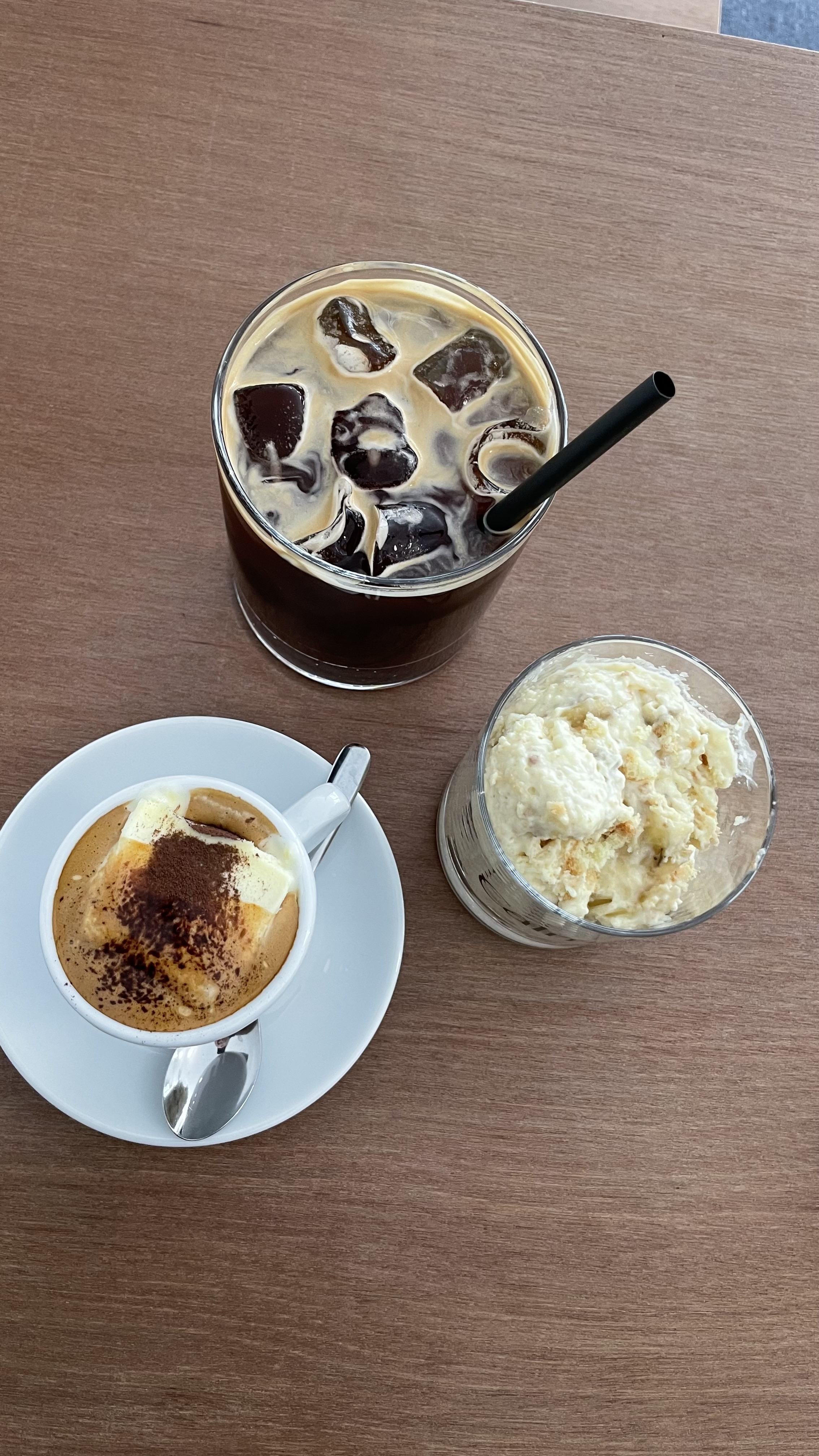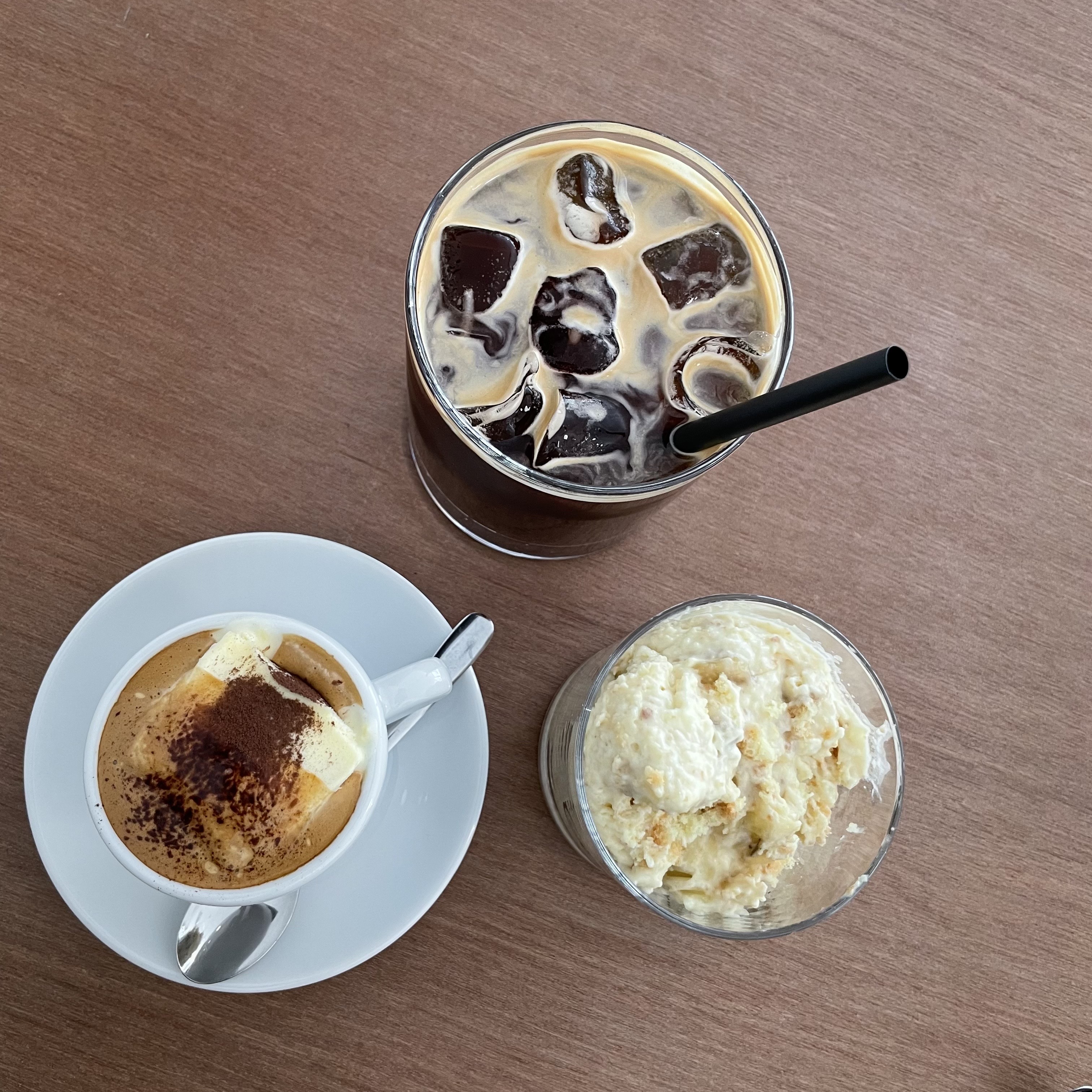 맨 오른쪽은 아이스아메리카노, 왼쪽은 바나나 푸딩입니다.