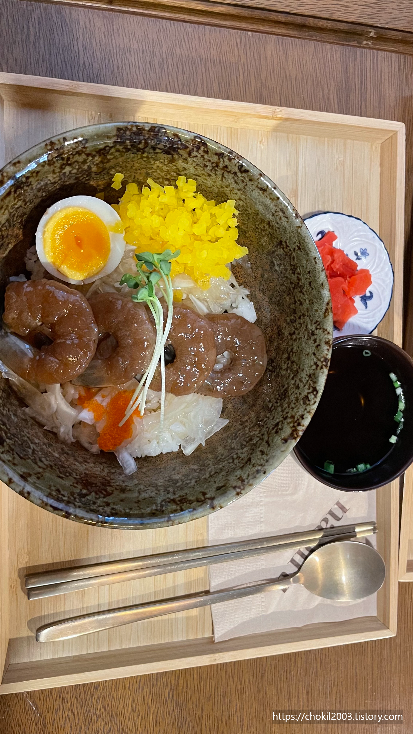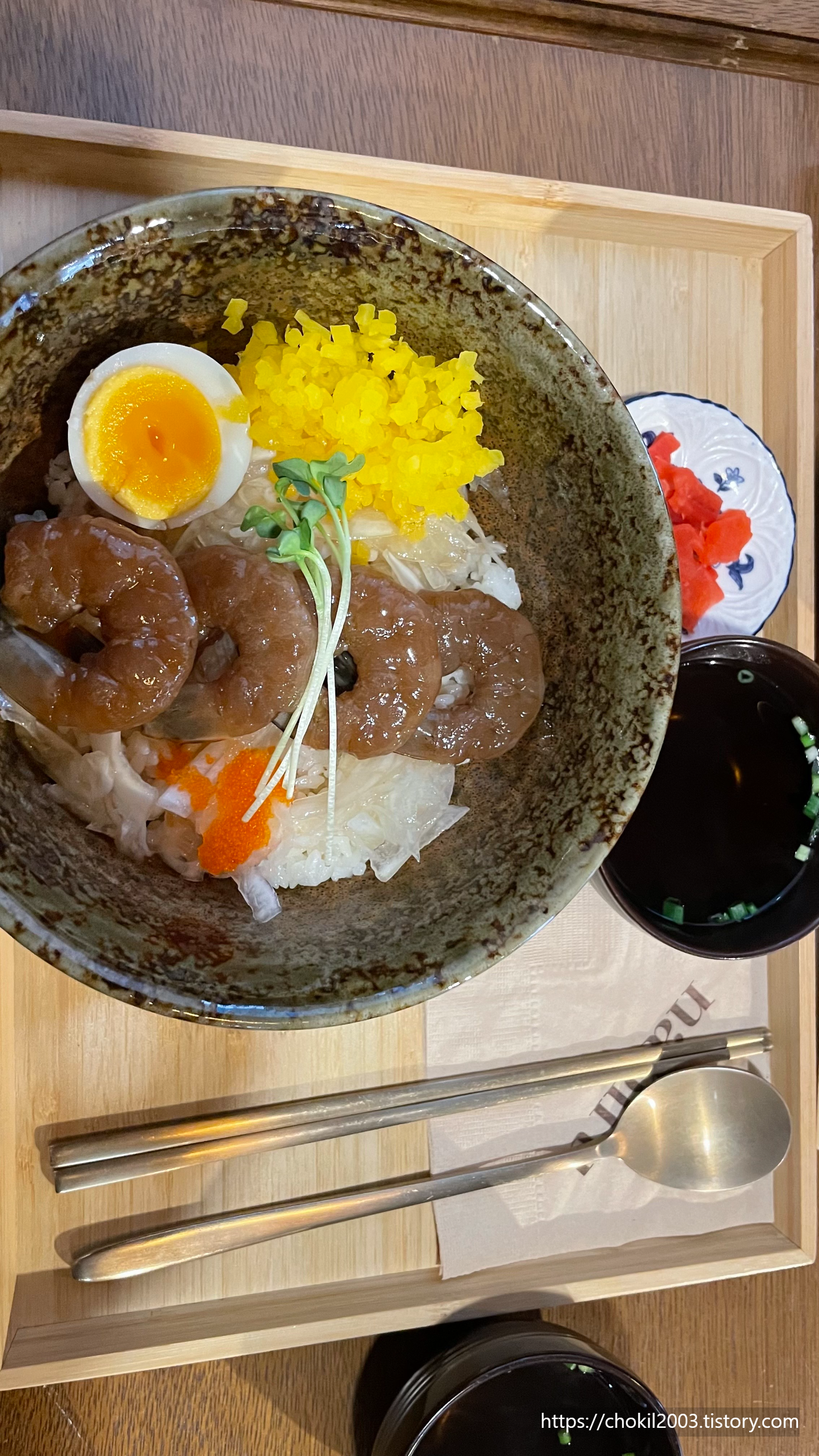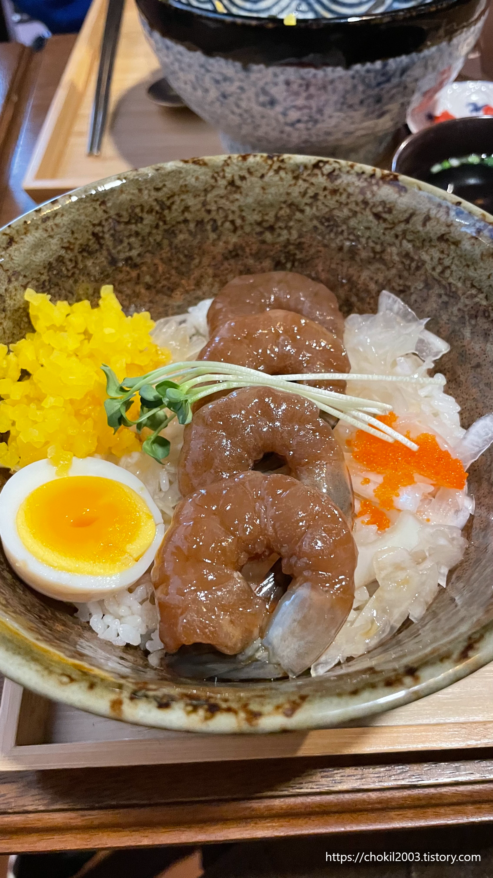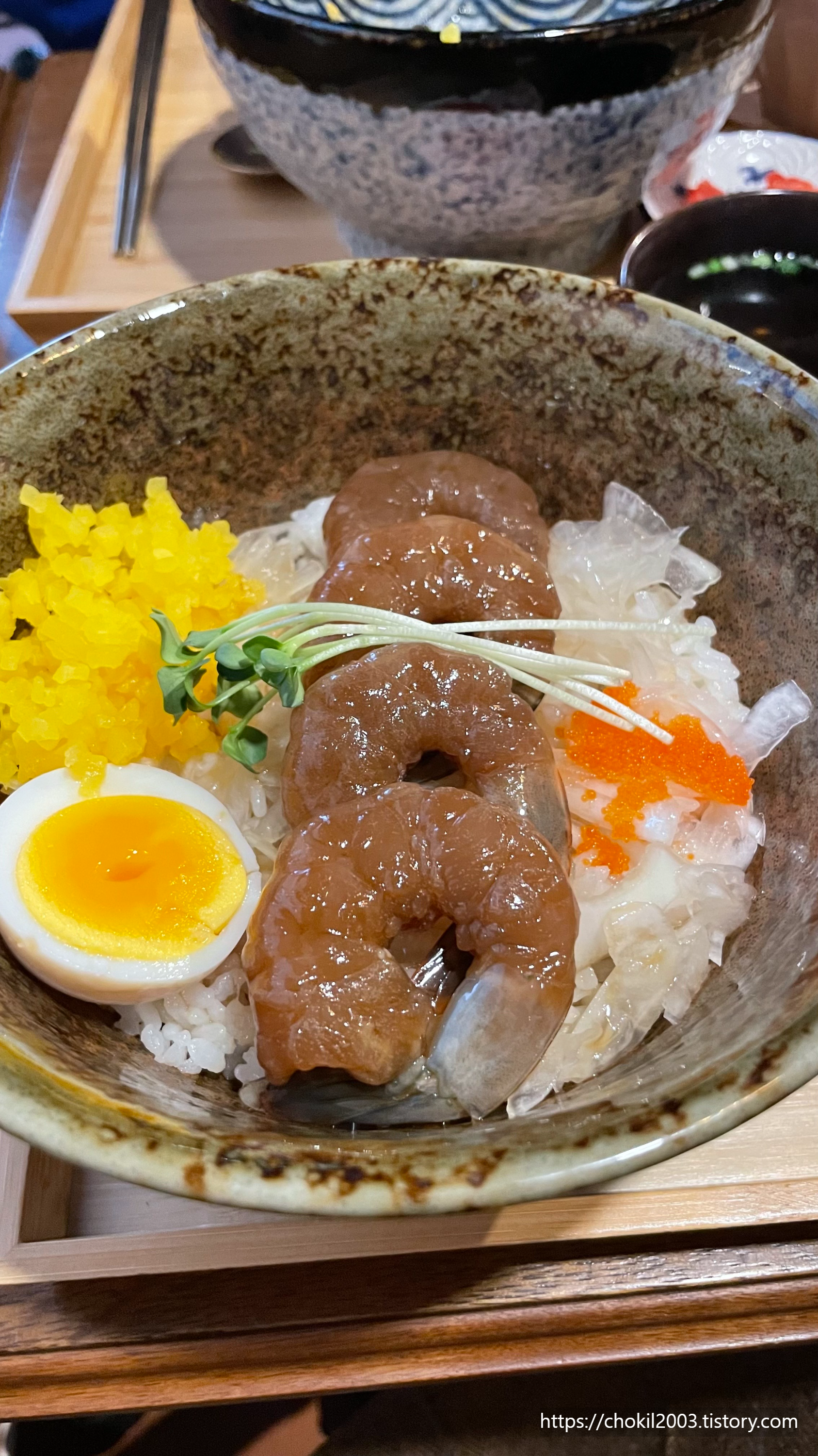 새우는 특제 간장소스에 3일간 저온숙성한 통새우와 반숙란을 곁들인 것인데요!