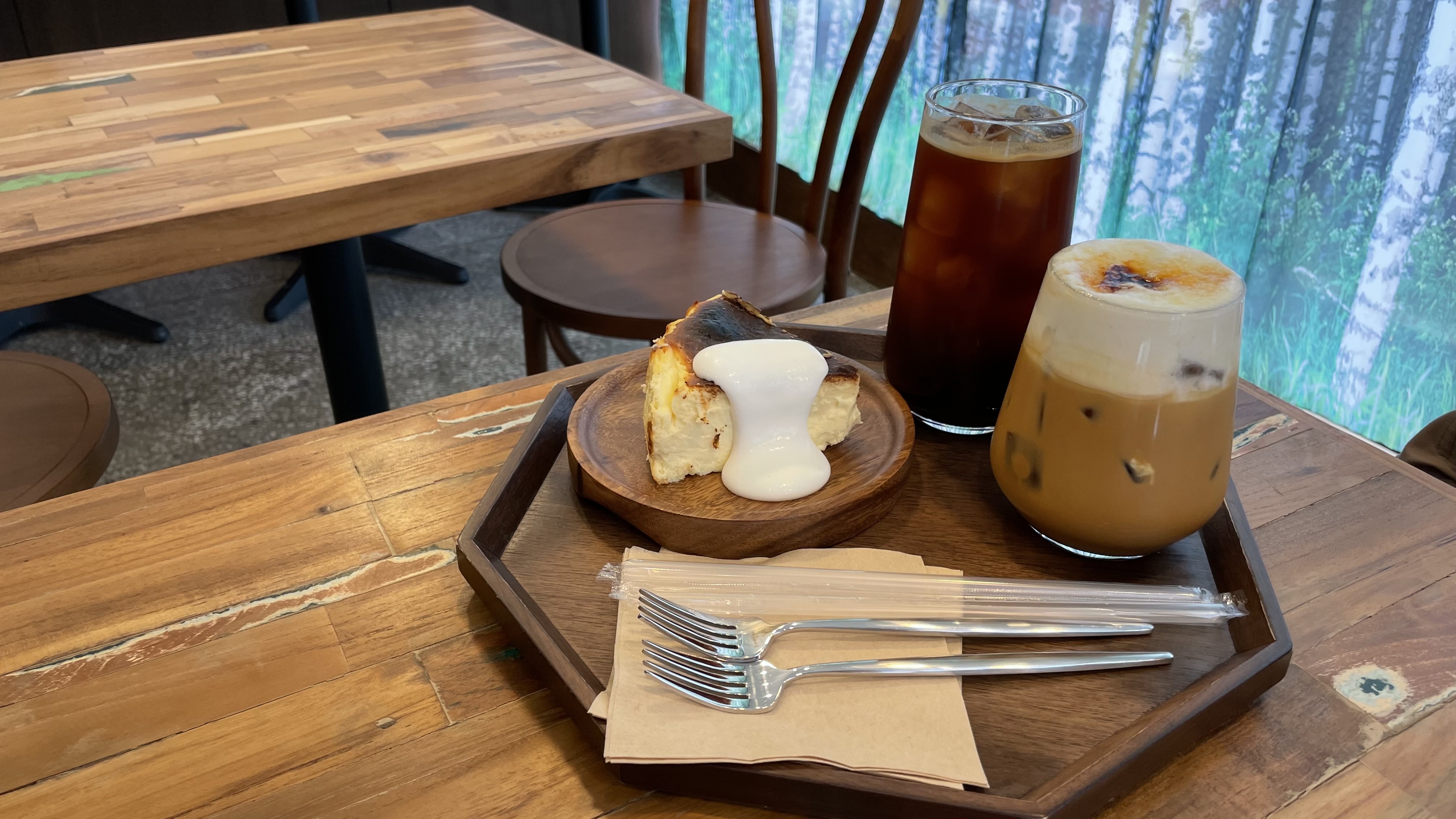 쟁반, 접시도 우드 한 느낌입니다. 치즈케이크와 잘 어울리네요.