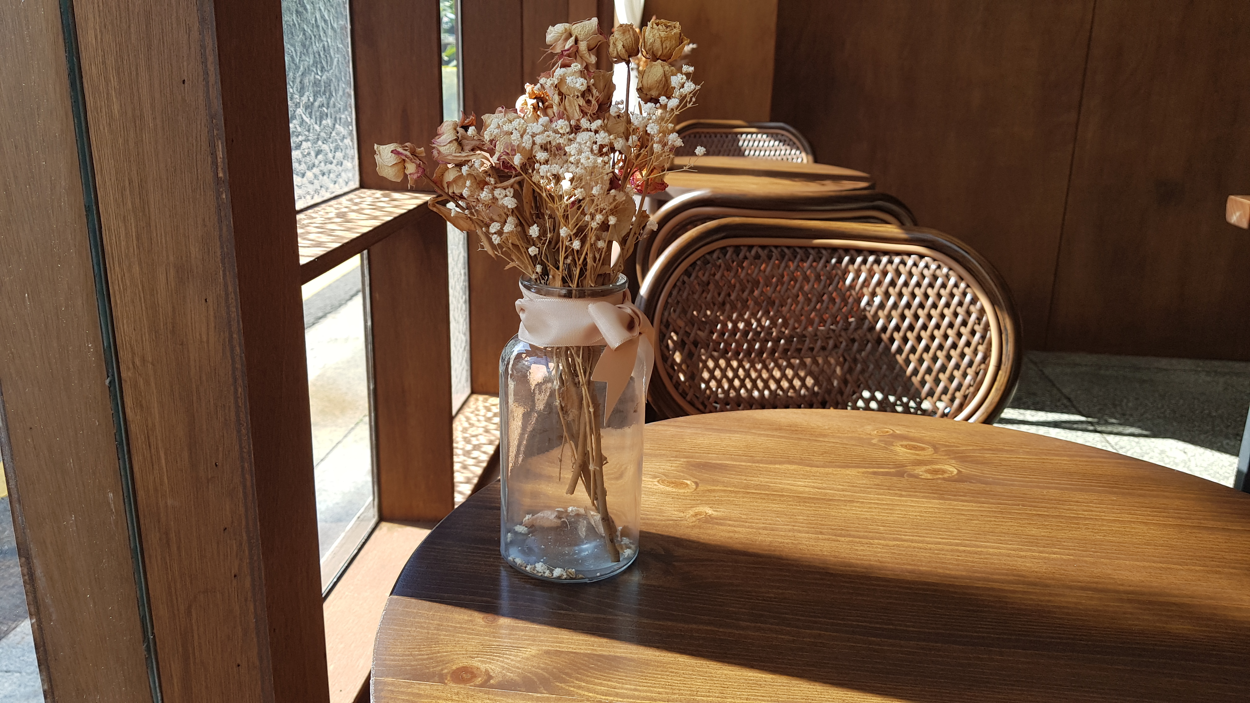 흥천공원 앞에 카페가 있습니다. 입구 모습인데요. 잠시 머물러 가는 곳. 좋은 커피 그리고 수제 디저트가 있는 곳이라고 합니다. 우드한 유리창 테두리와 입간판이 눈에 들어옵니다.