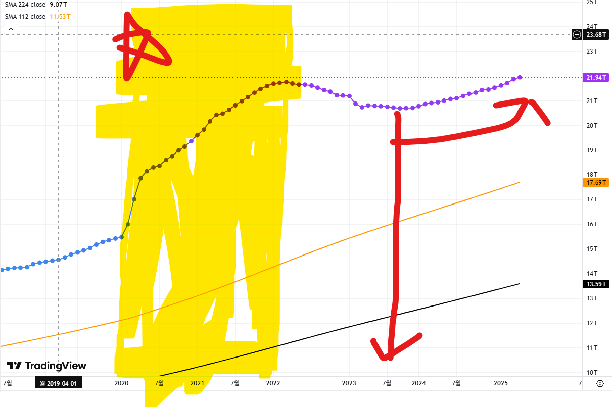코로나 시기가 끝나고 금리를 올리고 m2 통화량이 줄어드는 것이 보이죠?
