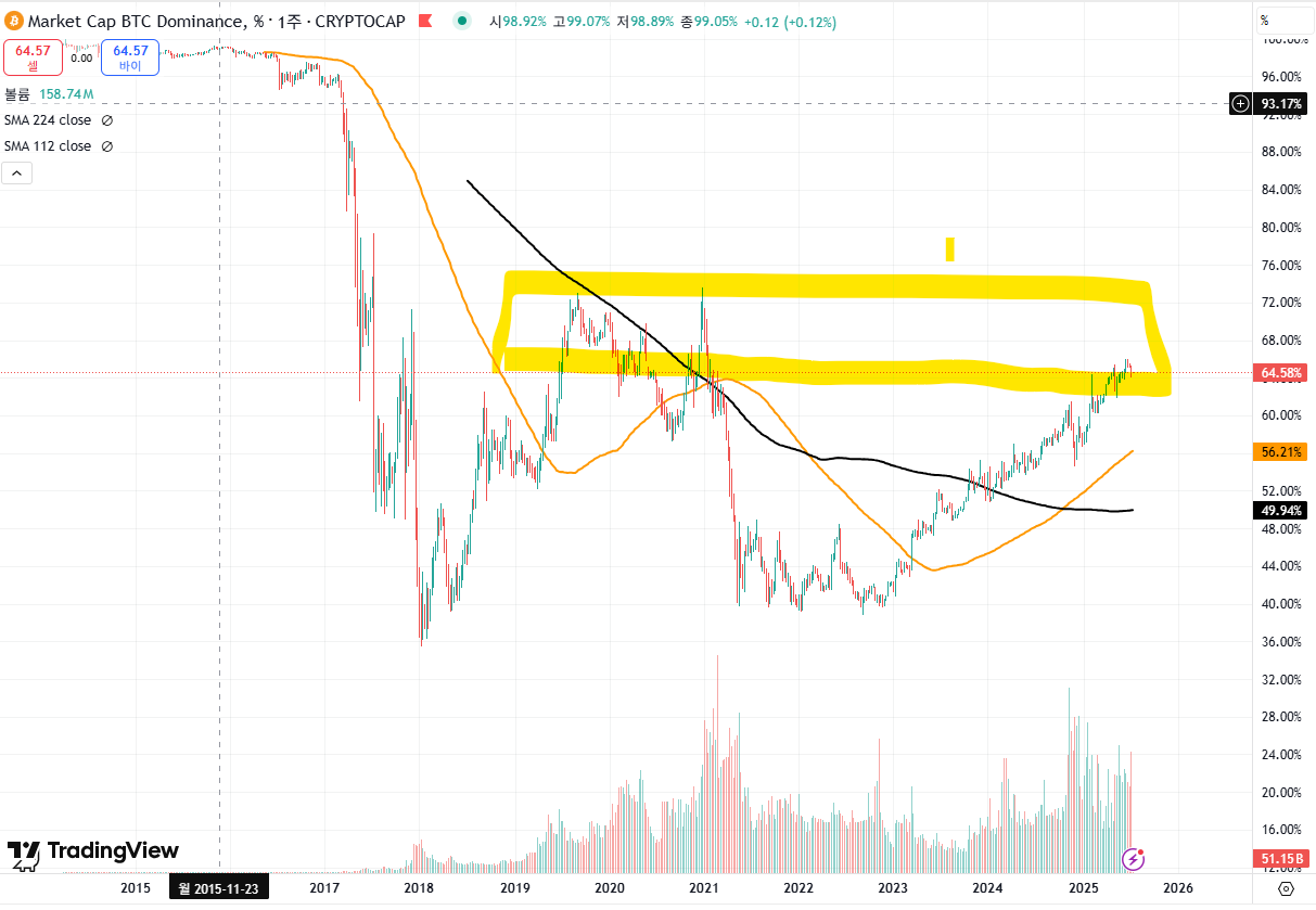 노란 박스가 비트코인 도미넌스 저항 구간인데요!