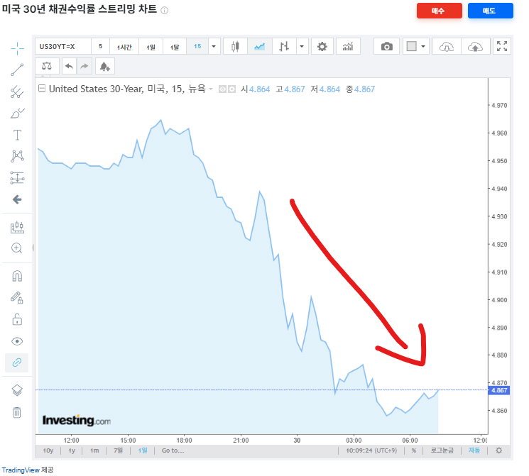 미국 30년 채권 금리가 하락한 것을 볼 수 있습니다.