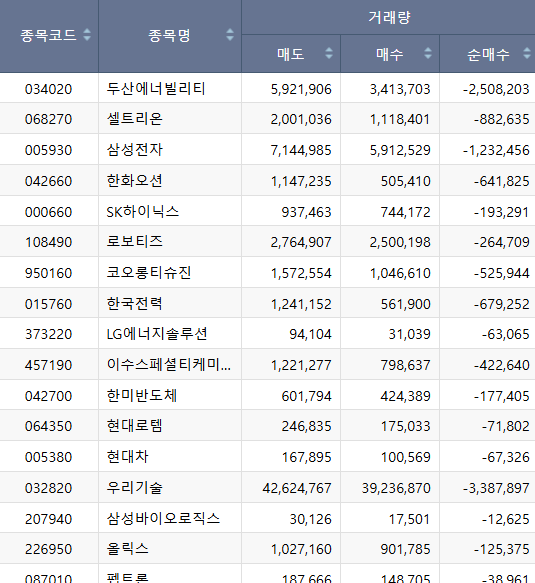 순매도에는 두산에너빌리티, 셀트리온, 삼성전자, SK하이닉스가 있어서 개인이 매도한 물량을 기관 외국인이 담았고 외국인, 기관이 판 것을 개인이 샀습니다.