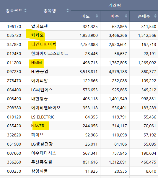 매도에 네이버와 HMM이 포함되어 있고 카카오도 포함되어 있습니다.
