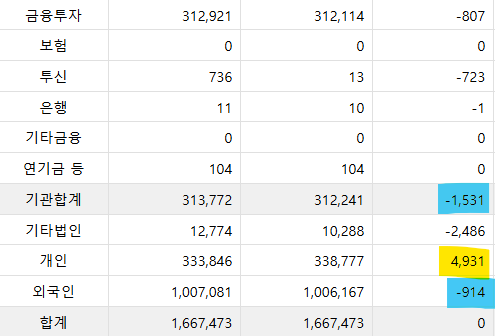개인도 엄청 매도한 것은 아니고 약간 차익실현 정도?