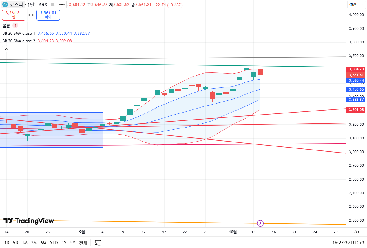 장 마감은 아쉽게 3,561.81 포인트로 -0.63% 하락 마감했습니다.
