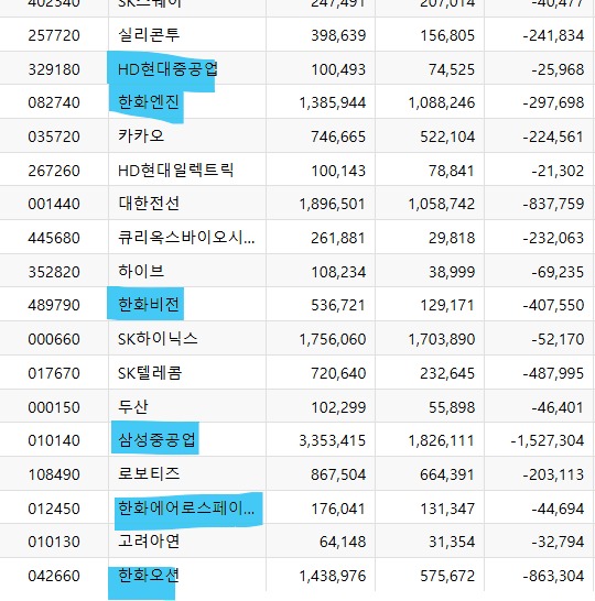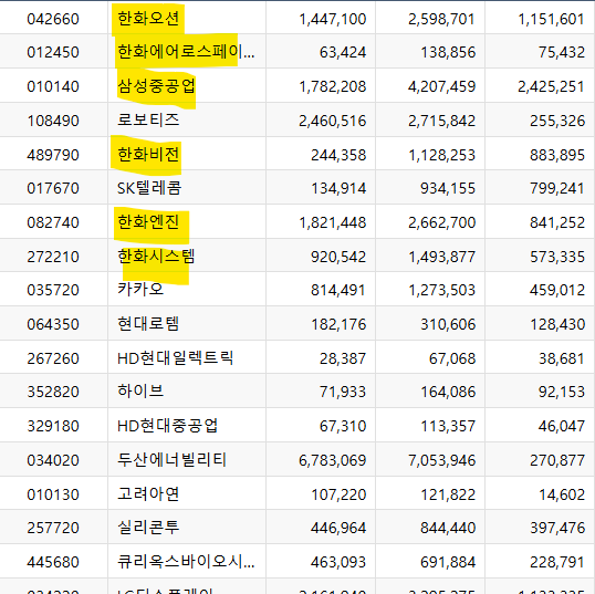 전체적으로 한화그룹의 종목을 매도한 모습을 보였고 조선업이 눈에 들어오네요!