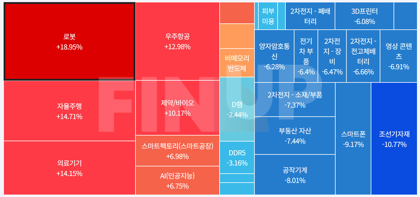 오늘 로봇과 자율주행, 의료기기, 우주항공, 제박/바이오, 스마트팩토리, AI 쪽이 많이 올랐고 조선기자재, 스마트폰, 공작기계, 부동산 자산, 2차 전지가 약세를 보였습니다.