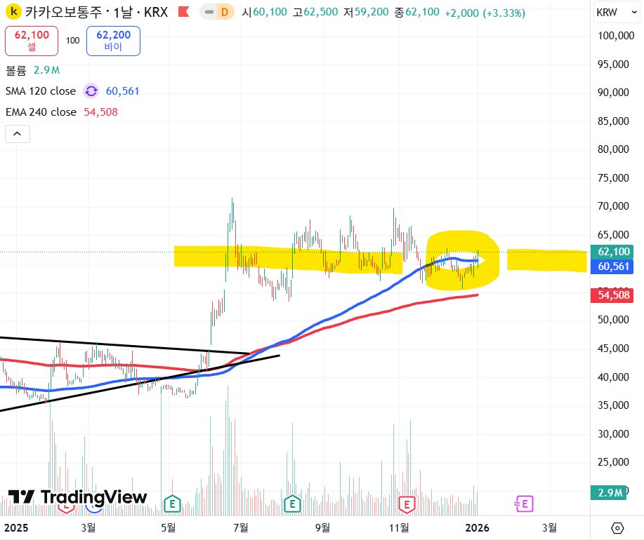 6만 초반에 외국인과 개인이 손바뀜 현상이 나왔으니 지금 들어온 외국인은 6만 초반 평단가라고 생각하시면 됩니다.