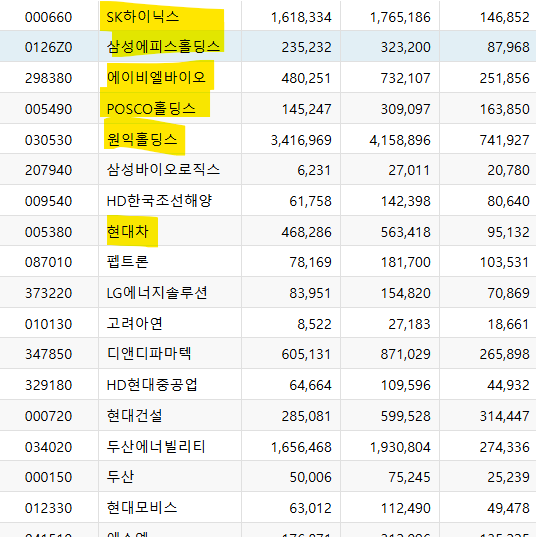 개인은 SK하이닉스를 사고 삼성전자를 매수한 것이 눈에 들어옵니다.