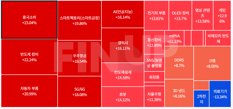 오늘 상승테마는 중국소비, 반도체장비, 자동차부품, 스마트팩토리, 우주항공, 반도체설계, 로봇 등등이 상승했습니다.