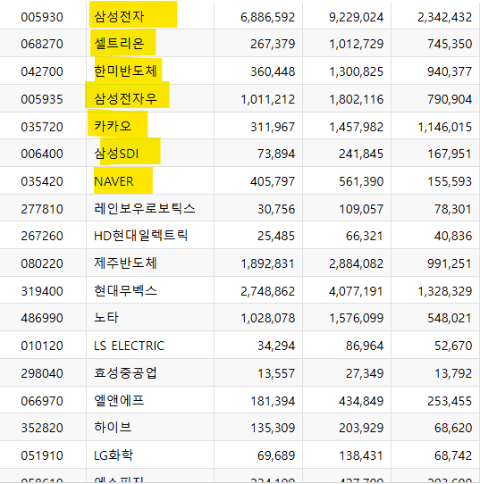 외국인은 삼성전자, 셀트리온, 한미반도체, 삼성전자우, 카카오, 네이버, 삼성SDI