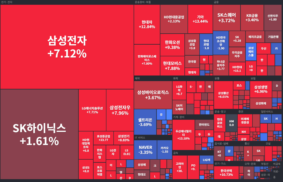 현재 1주일 동안 삼성전자는 +7%, sk하이닉스 +1% 현대차+12%이고 셀트리온이 -3.69%, 네이버-3.35%입니다.