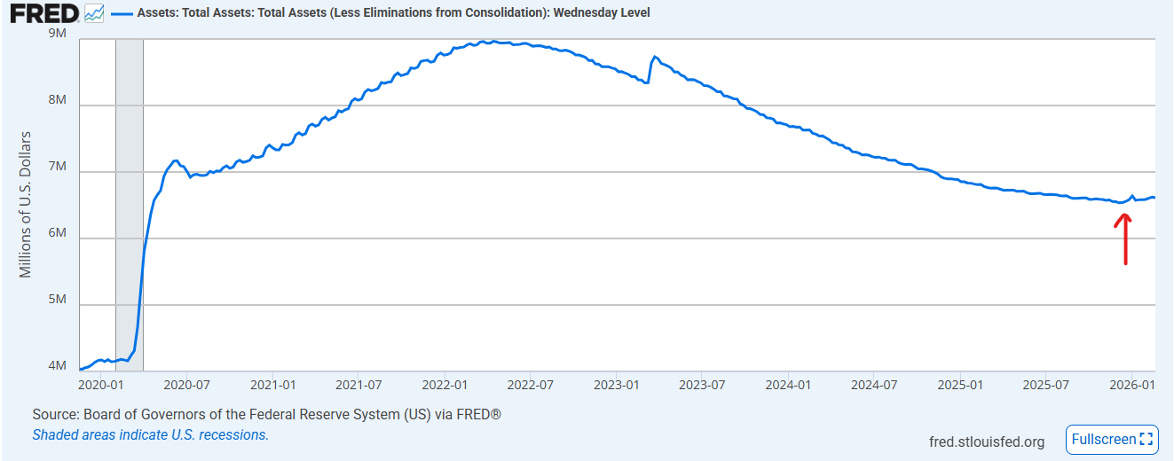빨간색 화살표가 작년 말 이번 연초에 단기자금이 부족할 때 QE를 통해 시중에 돈을 투입한 흔적입니다.