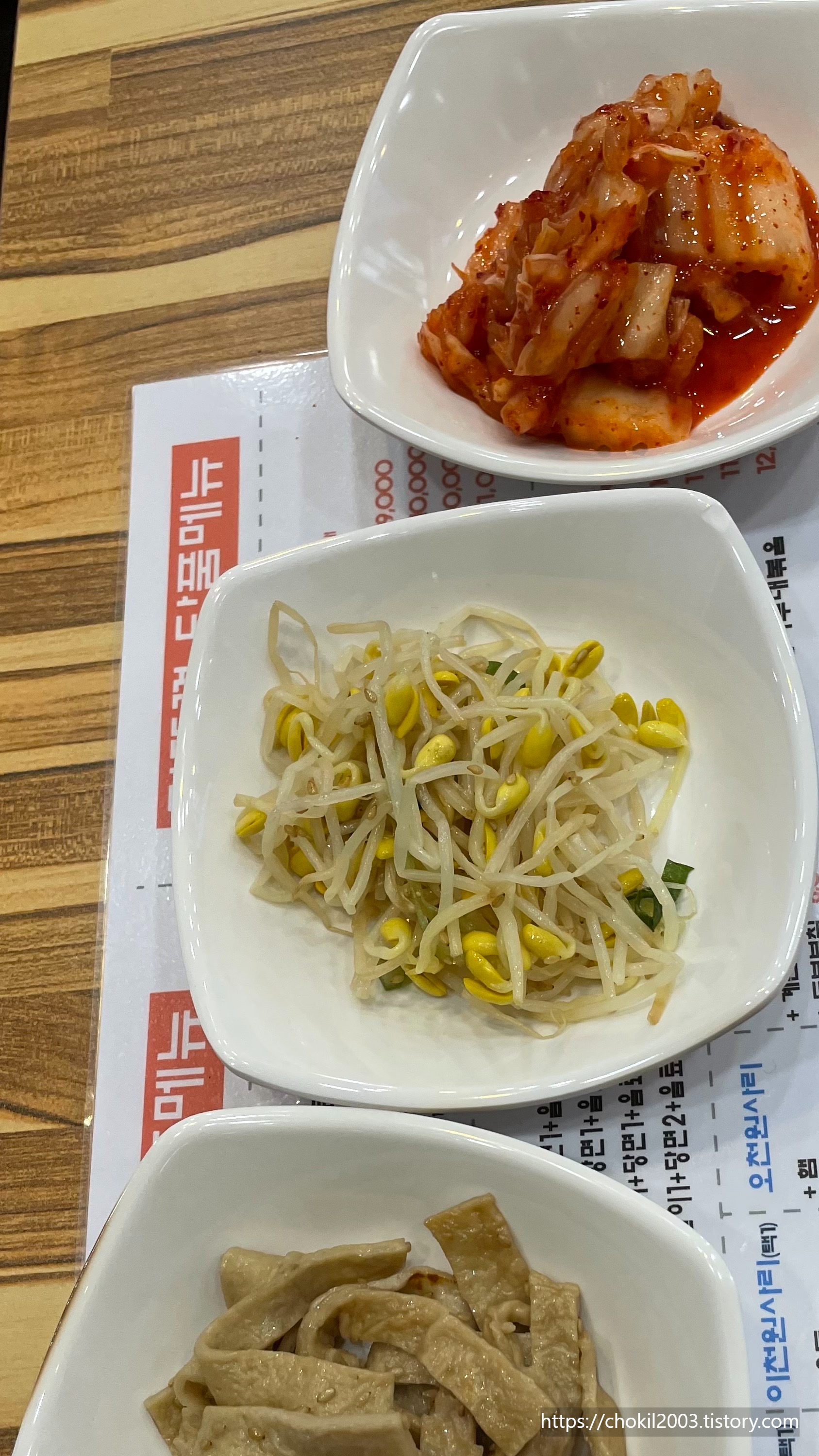 기본 반찬은 김치, 콩나물, 어묵볶음이 있습니다.