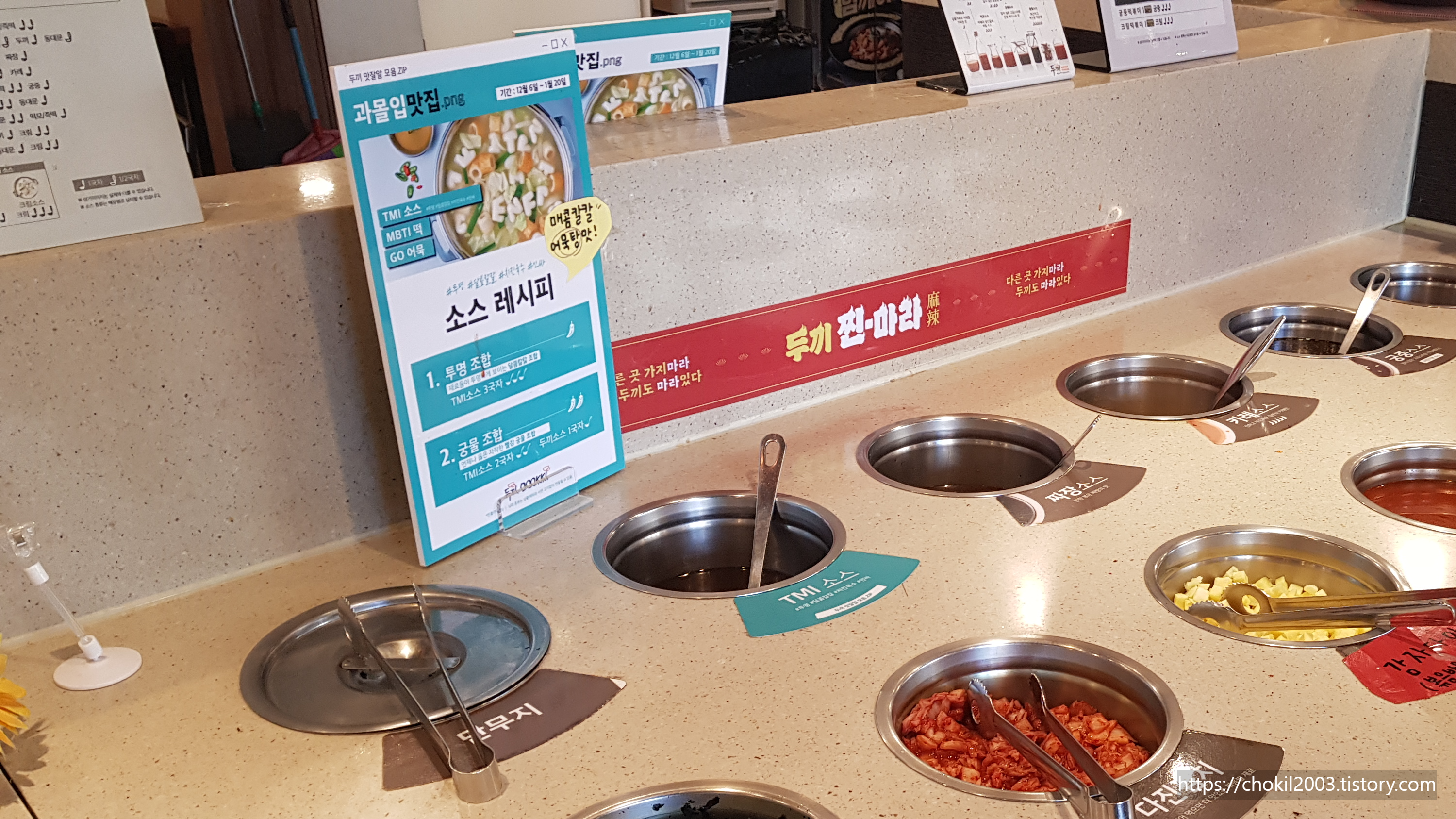 1. 두끼2 + 떡모1/2 + 마라탕소스 2 + 마유소스(취향)
